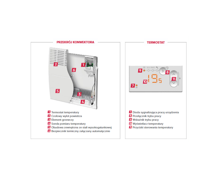 - Wielostopniowy przełącznik trybów pracy: KOMFORT, EKO, ANTYZAMARZANIE, STOP, PROGRAMATOR, TIMER, OTWARTE OKNO.