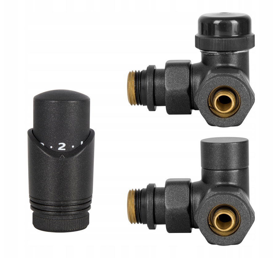 Funkcjonalny zestaw termostatyczny przeznaczony do montażu na grzejnikach z podłączeniem od dołu. Dzięki osiowej budowie oraz estetycznemu wykończeniu w kolorze antracytowym, idealnie pasuje do nowoczesnych wnętrz oraz grzejników dekoracyjnych. Wersja prawa – zawory ustawione po prawej stronie grzejnika.