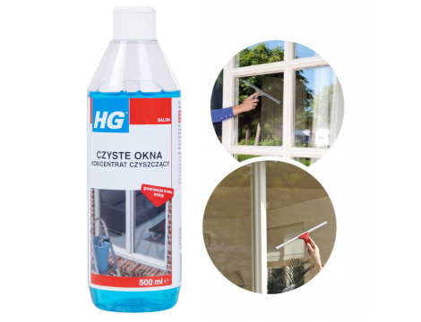 - HG Czyste okna – koncentrat czyszczący to super stężony środek, który skutecznie czyści i odtłuszcza okna, nie pozostawiając smug. Produkt nie zawiera amoniaku ani alkoholu metylowego, co czyni go bezpiecznym dla różnych powierzchni.