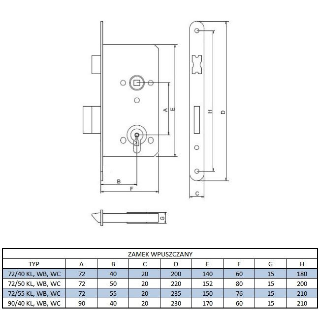 Hobes zamek wpuszczany 72/40 klucz 2-6013
