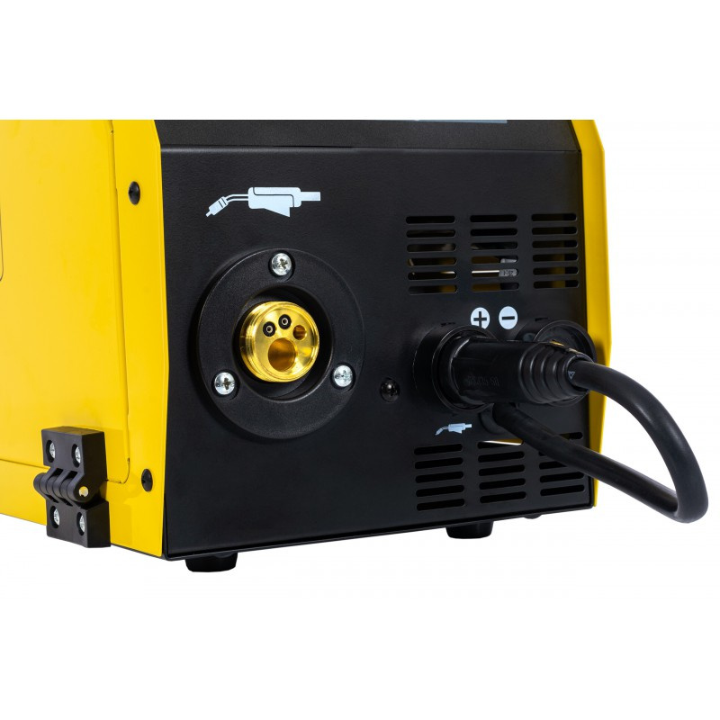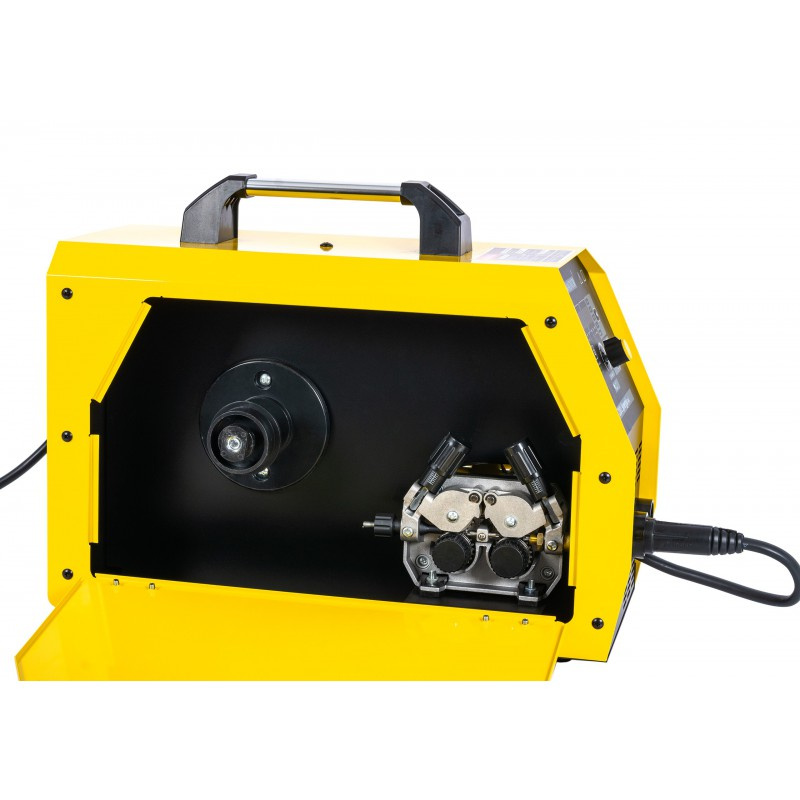 Urządzenie posiada płynną regulacje parametrów spawania, wyposażone jest w przeciążeniowy układ zabezpieczenia termicznego, zapobiegający nadmiernemu przegrzewaniu się. Spawarka wyposażona jest w 4-rolkowy podajnik drutu z gniazdem EURO co pozwala na podłączenie różnych typów uchwytów spawalniczych.