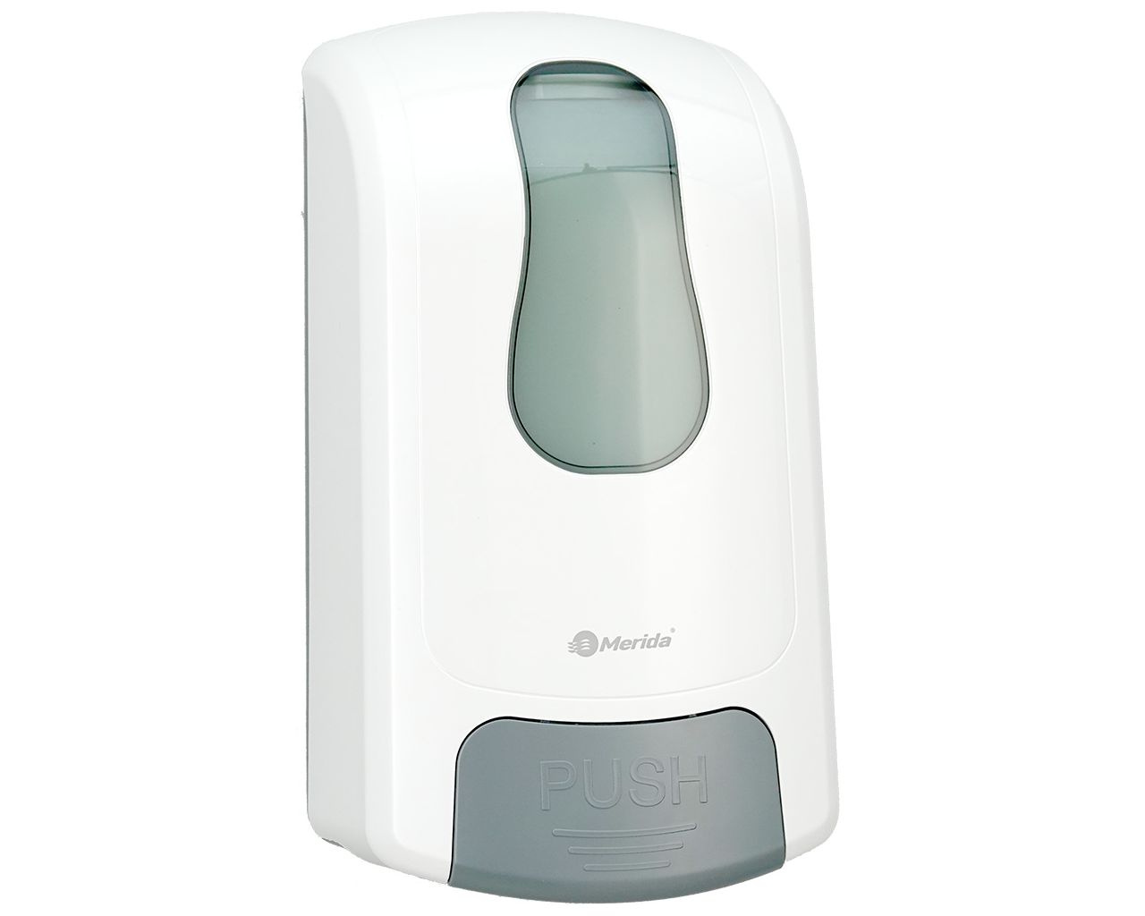 - Dozownik mydła w płynie Merida ONE DEB103 to eleganckie i trwałe urządzenie wykonane z białego tworzywa ABS. Posiada pojemność 1000 ml, możliwość regulacji ilości dozowanego mydła (0,6 ml lub 1,2 ml) oraz zamknięcie na kluczyk.
