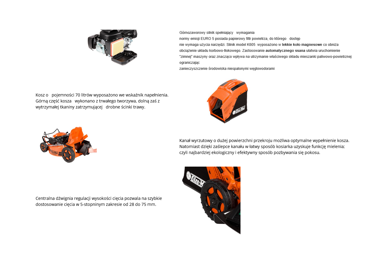 - Wzmocniona i ergonomiczna dźwignia regulująca wysokość cięcia (w zakresie 5 pozycji).