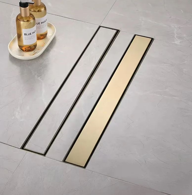 Maskownica w odpływie jest obustronna – z jednej strony złota szczotkowana, a z drugiej przystosowana do wklejenia płytki, co pozwala na idealne dopasowanie do aranżacji wnętrza. Dzięki takiemu rozwiązaniu odpływ pozostaje dyskretny, a cała strefa prysznicowa nabiera minimalistycznego i eleganckiego charakteru.
