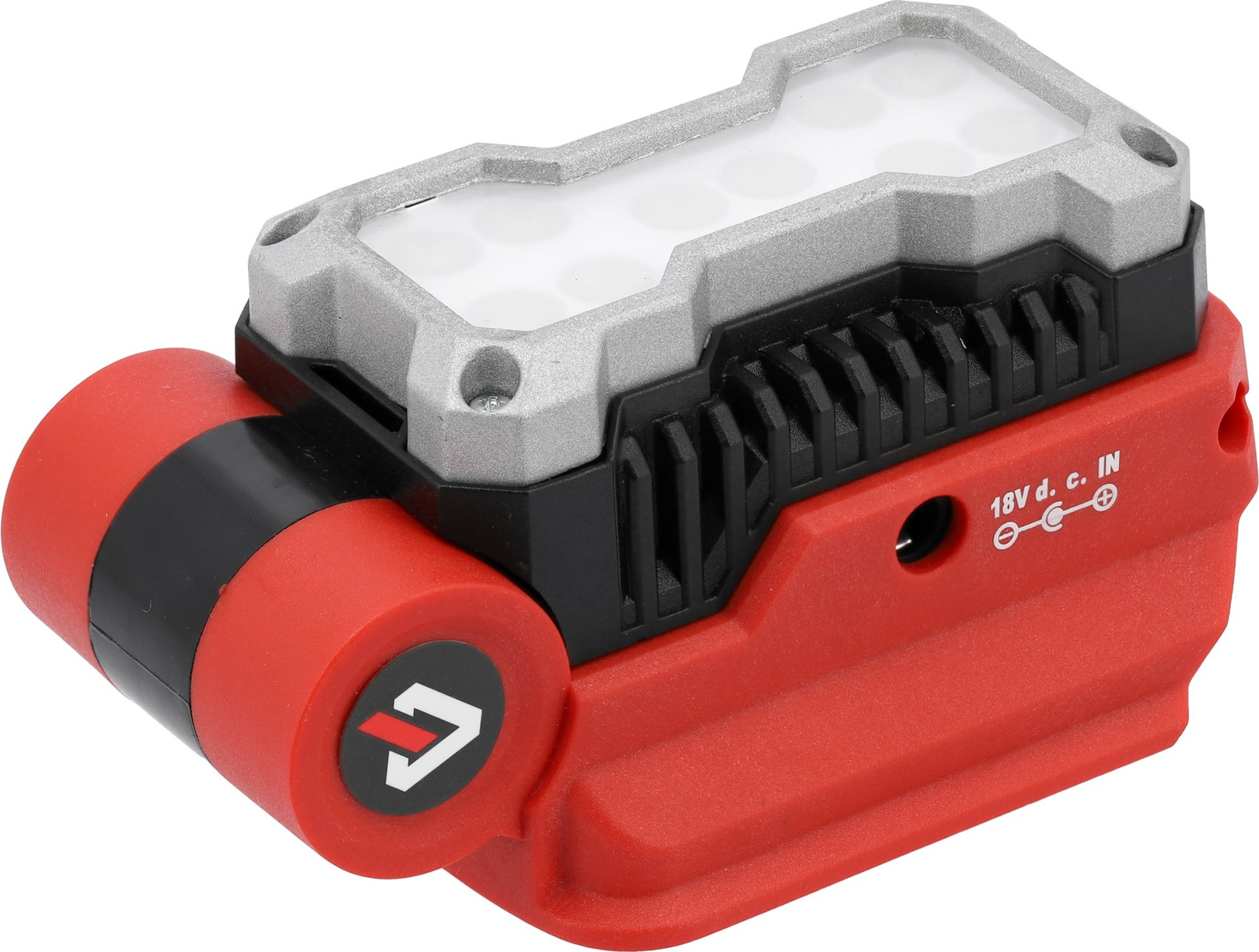 Przenośna akumulatorowa lampa robocza przystosowana do pracy na budowie, w warsztacie i do oświetlenia kempingu lub biwaku. Regulowany kąt świecenia i bardzo wytrzymała obudowa, wzmocniona włóknem szklanym, zachowuje wysoką odporność na uszkodzenia mechaniczne i warunki zewnętrzne. Dzięki 10 diodom SMD LED zapewnia intensywne, jasne światło o szerokim kącie padania, co umożliwia skuteczne oświetlenie dużych powierzchni roboczych.