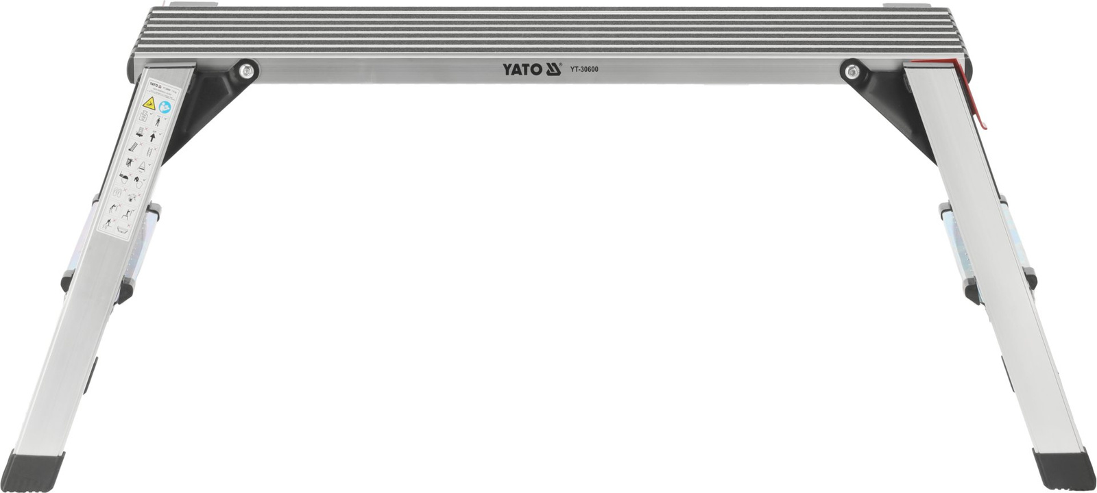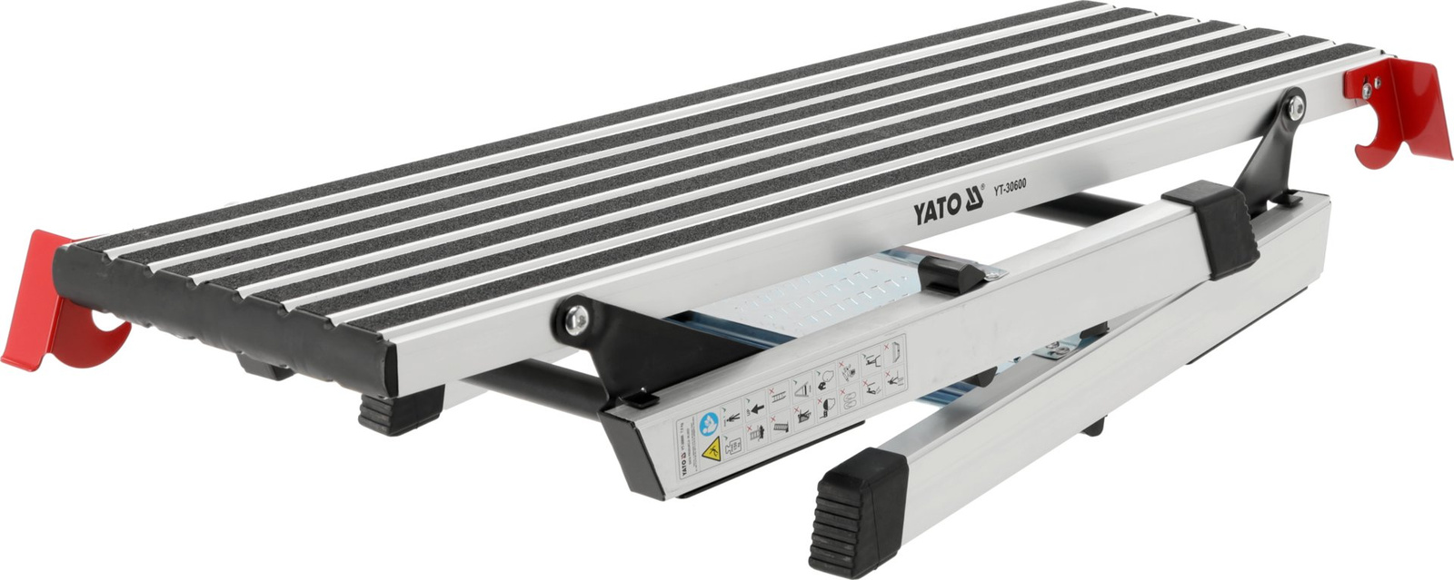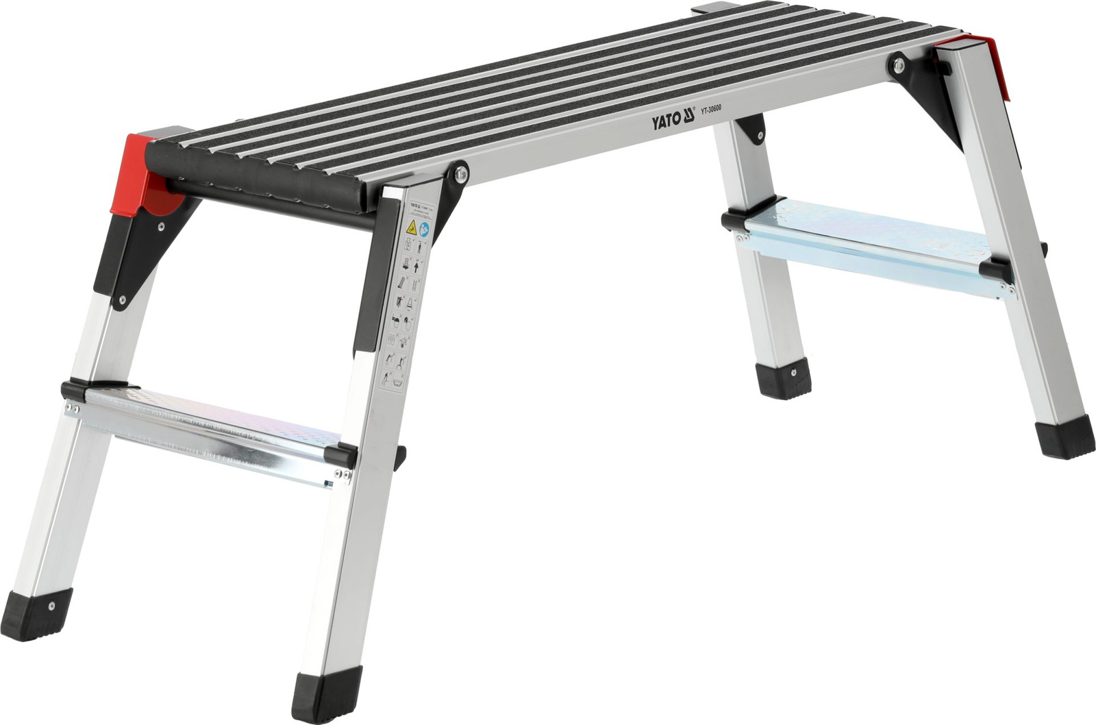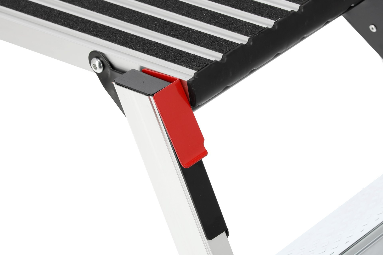 • Składany podest roboczy wykonany z profili aluminiowych. Dla bezpieczeństwa użytkowania podest pokryty jest listwami antypoślizgowymi, a stopnie mają przetłoczenia. Wygodę rozkładania zapewniają duże zamki blokujące. Wymiary po rozłożeniu: 96x30,5x49cm.