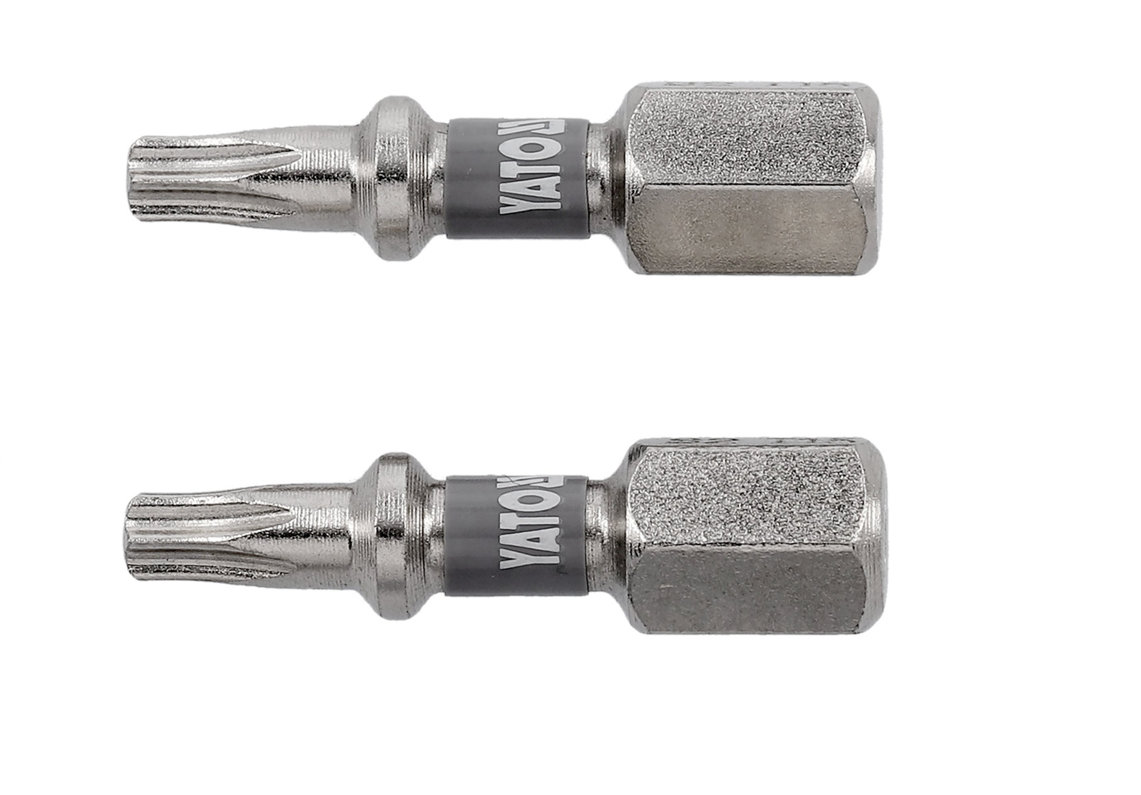 - Bity Yato YT-78012 T15 (2 szt.) 25 mm, wykonane z wytrzymałej stali S2 z powłoką niklową. Pasują do wkrętarek HEX 1/4", idealne do prac montażowych i serwisowych. Odporne na ścieranie, zapewniają precyzyjne osadzenie w śrubach.