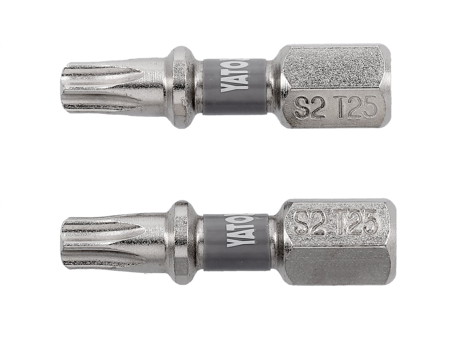 • Bity Yato YT-78014 T25 (2 szt.) 25 mm, wykonane z wytrzymałej stali S2 z powłoką niklową. Pasują do wkrętarek HEX 1/4", idealne do prac montażowych i serwisowych. Odporne na ścieranie, zapewniają precyzyjne osadzenie w śrubach.