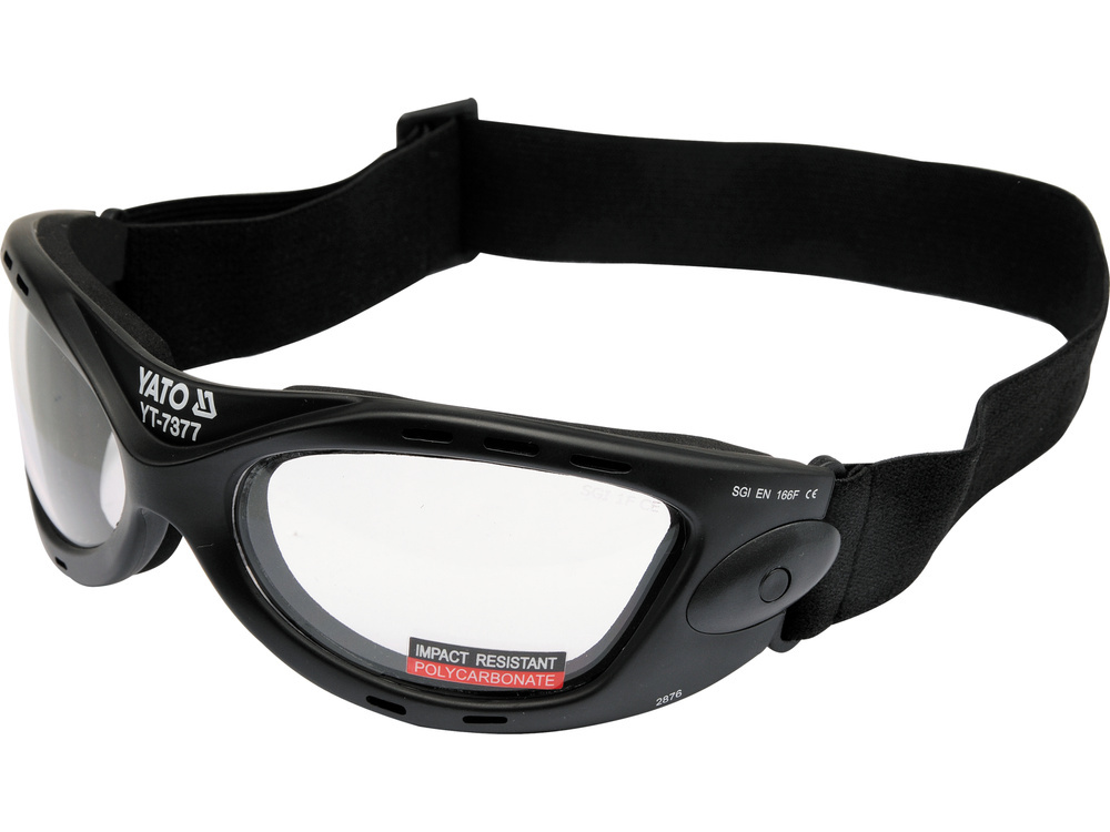 Profesjonalne gogle ochronne marki YATO, przeznaczone do ochrony oczu przed odpryskami, pyłem oraz cząstkami stałymi podczas pracy w trudnych warunkach (np. budowa, przemysł, obróbka mechaniczna, szlifowanie, cięcie).