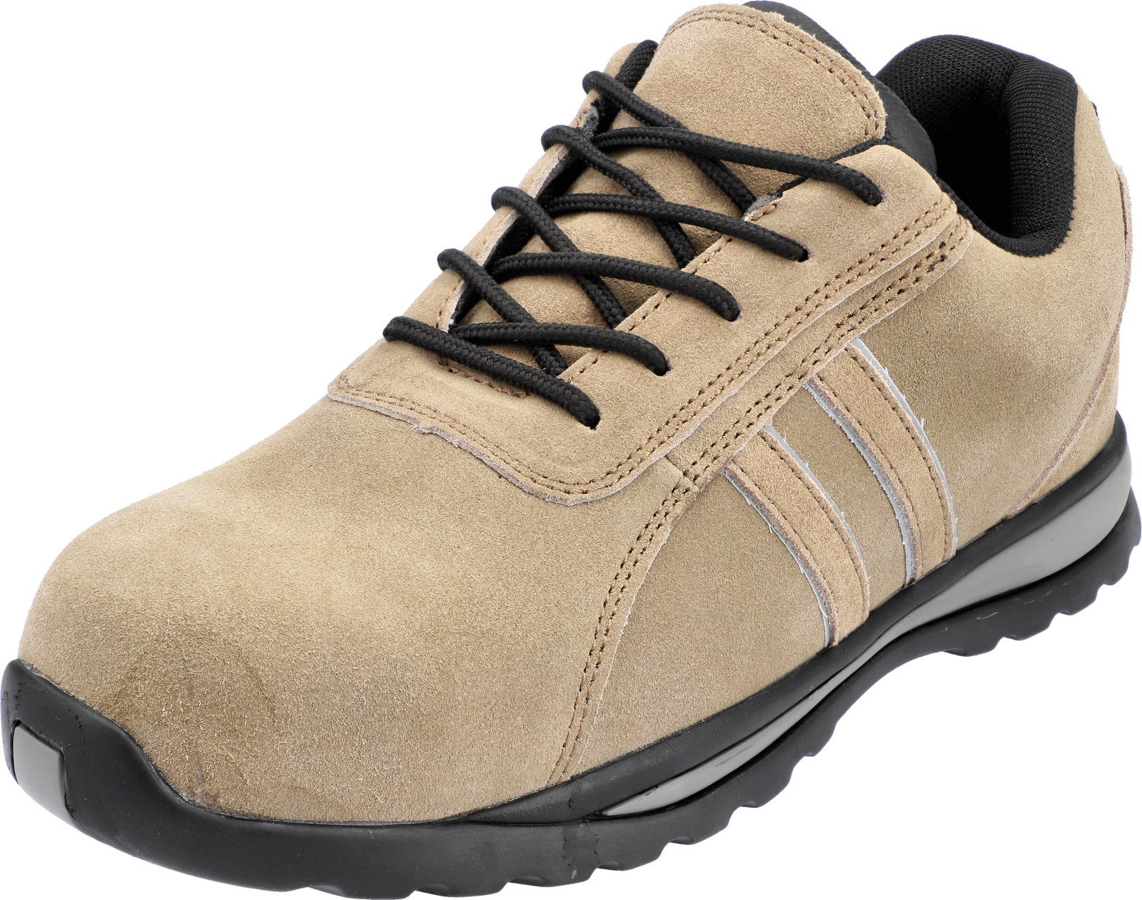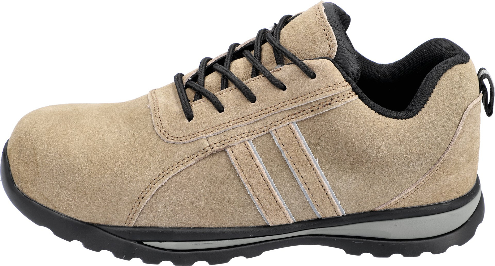 Półbuty nie zawierają metalu. Zarówno wkładka antyprzebiciowa, jak i gumowa podeszwa są elastyczne i – w przeciwieństwie do butów z tradycyjną podeszwą z PU i wkładką stalową – nie ograniczają zgięć śródstopia. Cholewkę z naturalnej skóry zamszowej ozdobiono odblaskowymi wstawkami poprawiającymi widoczność użytkownika.