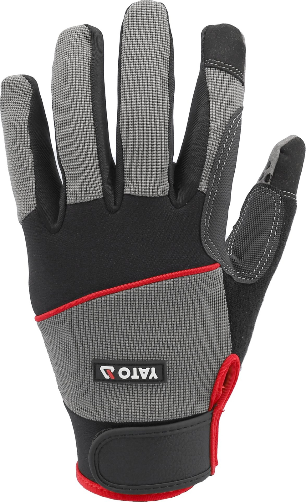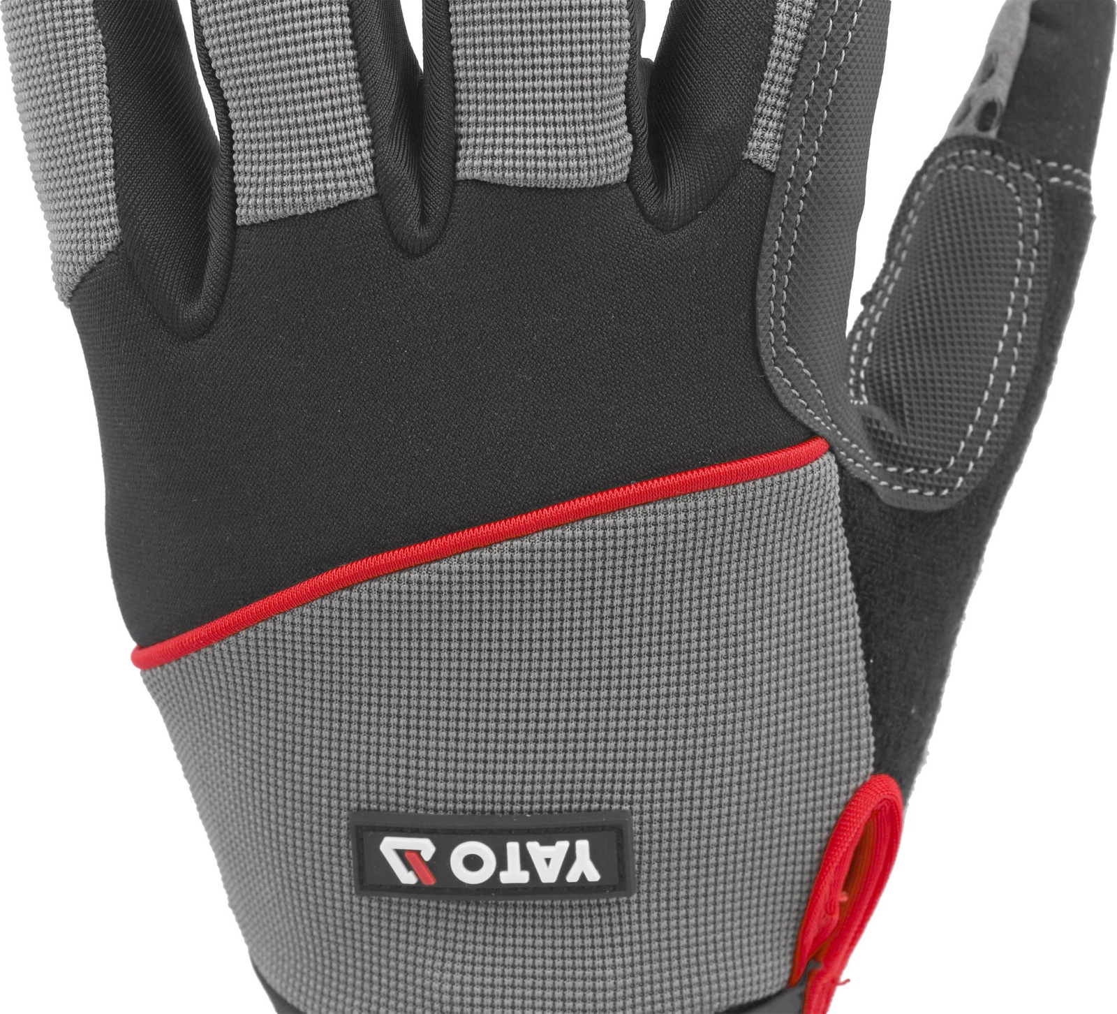Rękawice robocze z dodatkowymi wzmocnieniami oraz sylikonowym anty-poślizgowym nakropieniem w części chwytnej, które znacznie ułatwia trzymanie przedmiotów i zmniejsza możliwość wyślizgnięcia się narzędzia z ręki. Polecane do pracy z narzędziami ręcznymi, elektronarzędziami czy podczas przenoszenia towarów. Wykonane ze skóry syntetycznej, dwuwarstwowej tkaniny z dodatkiem spandexu oraz z neoprenu. Skóra syntetyczna wraz z dodatkowymi wzmocnieniami i sylikonowym nakropieniem w części chwytnej gwarantują wysoką wytrzymałość, dobre dopasowanie do dłoni i przede wszystkim wzmacniają chwyt. Neopren na kostkach rozciąga się i pracuje wraz z zgięciami dłoni. Na kciuku tkanina typu frotte do ocierania potu. Dwuwarstwowa tkanina w części wierzchniej z wytrzymałego nylonu z dodatkiem tworzywa nadającego mu elastyczność to nie tylko dobra ochrona przed zagrożeniami mechanicznymi, ale także wysoki komfort pracy.