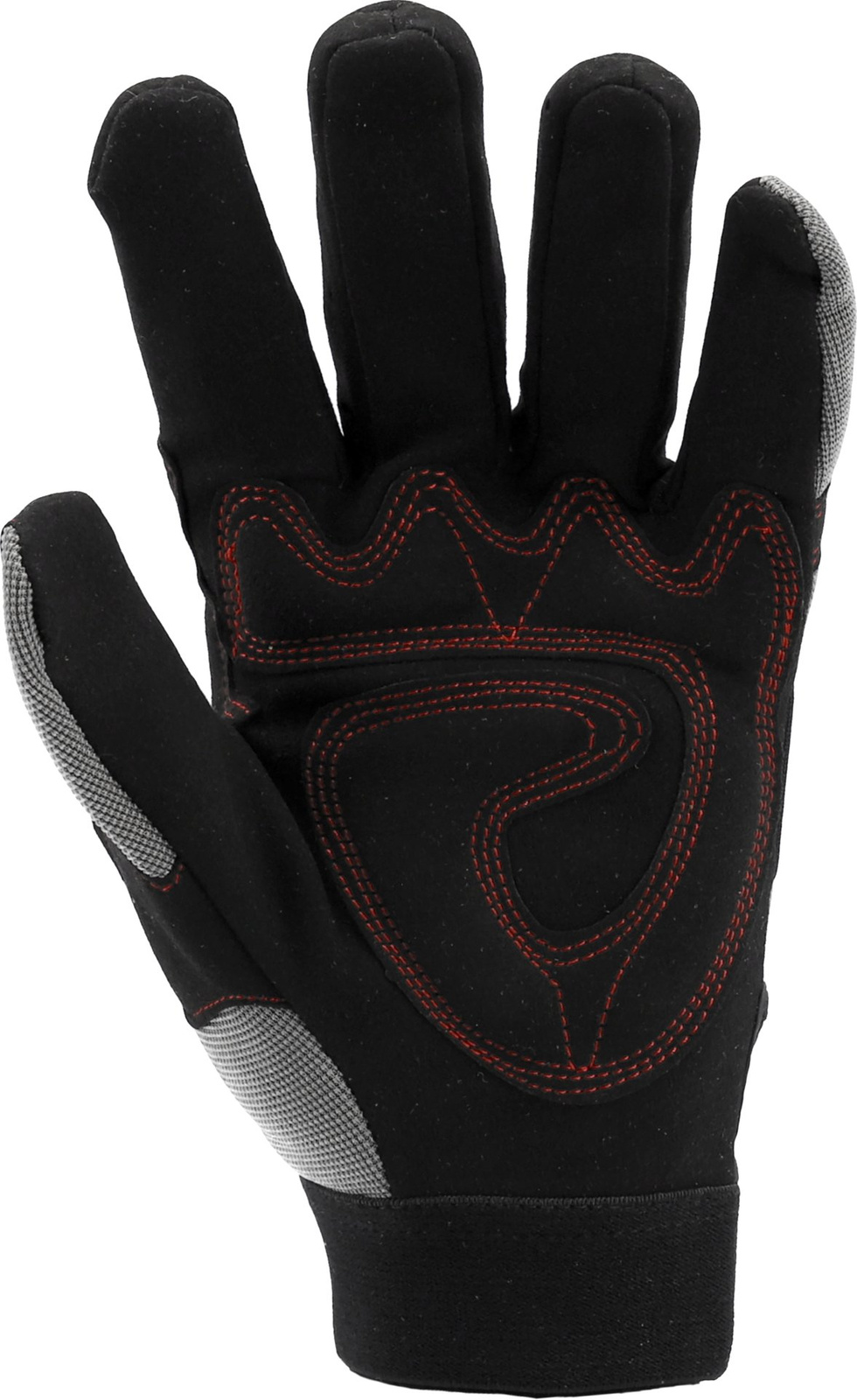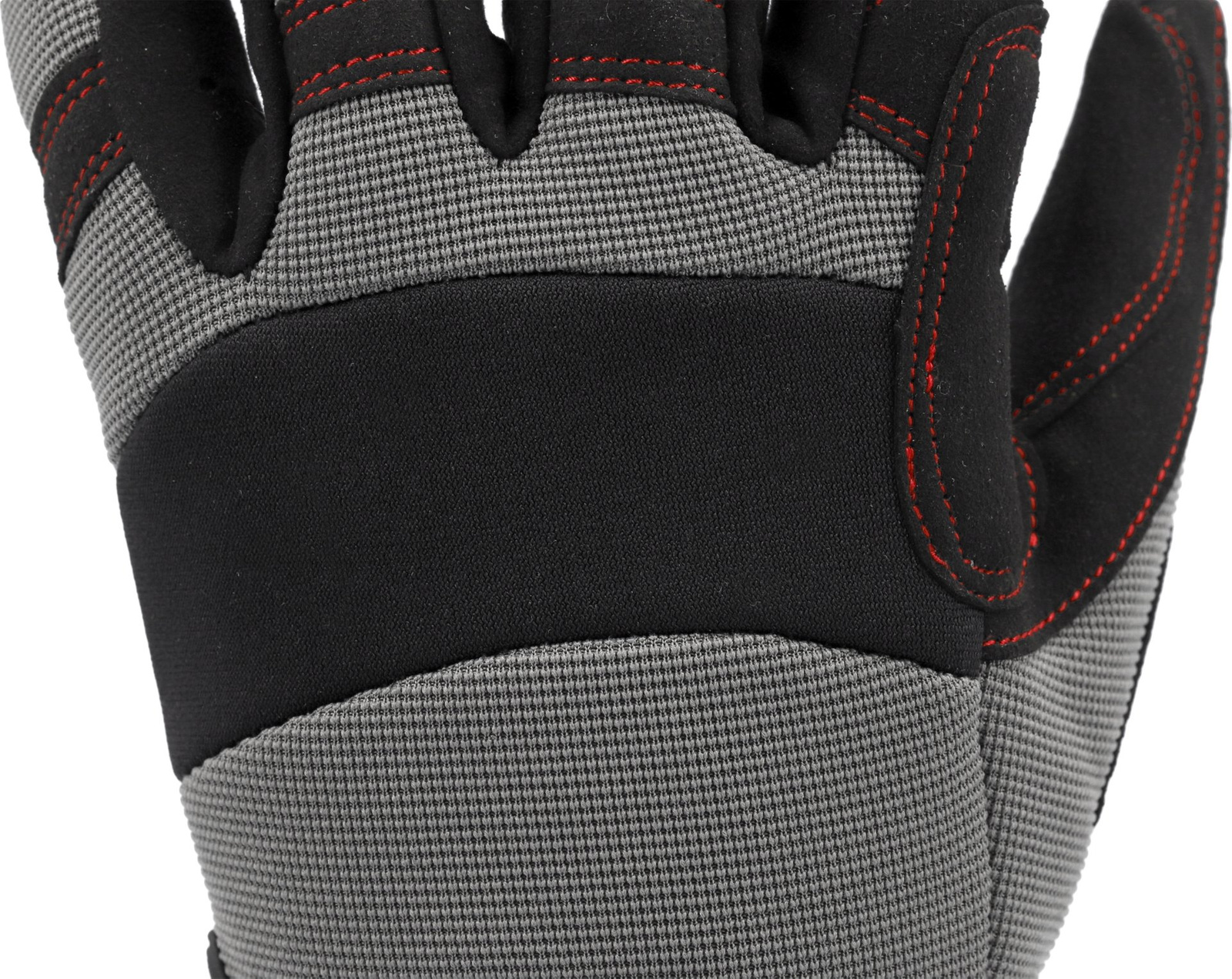 Rękawice robocze z dodatkowymi wzmocnieniami polecane do pracy z narzędziami ręcznymi, elektronarzędziami udarowymi, czy np. podczas układania kostki brukowej. Wykonane ze skóry syntetycznej, dwuwarstwowej tkaniny z dodatkiem spandexu oraz z neoprenu. Skóra syntetyczna wraz z dodatkowymi wzmocnieniami w części chwytnej gwarantują wysoką wytrzymałość i dobre dopasowanie do dłoni. Poduszki chronią przed powstawaniem odcisków. Neopren na kostkach rozciąga się i pracuje wraz z zgięciami dłoni. Dwuwarstwowa tkanina w części wierzchniej z wytrzymałego nylonu z dodatkiem tworzywa nadającego mu elastyczność to nie tylko dobra ochrona przed zagrożeniami mechanicznymi, ale także wysoki komfort pracy.