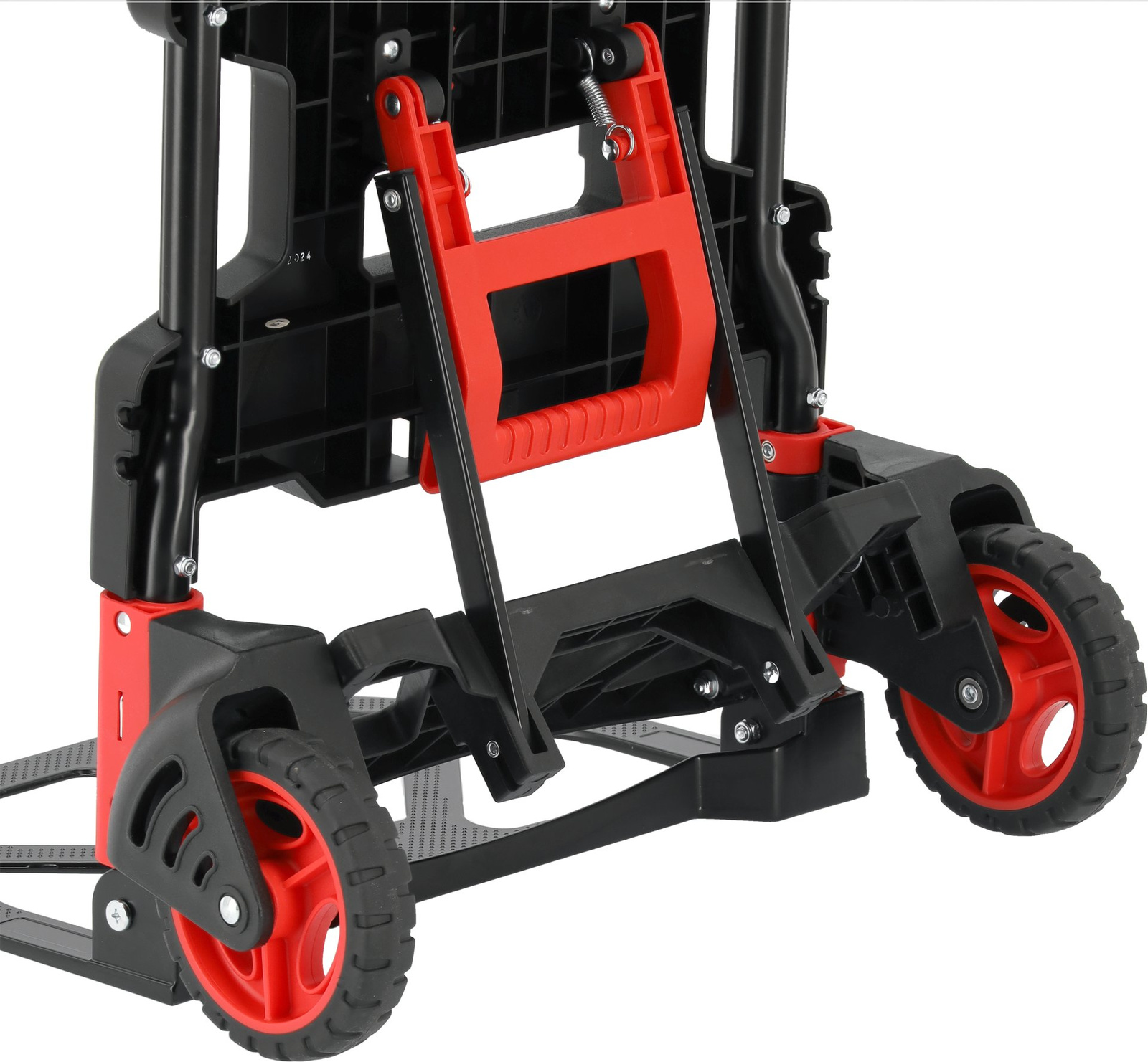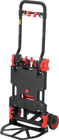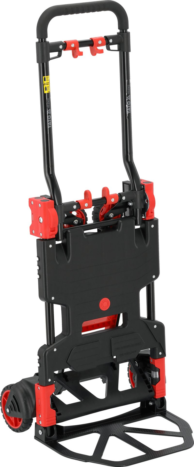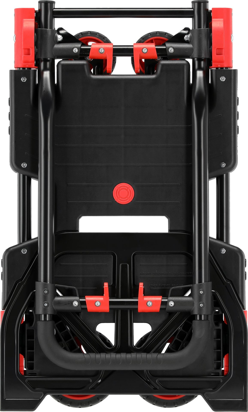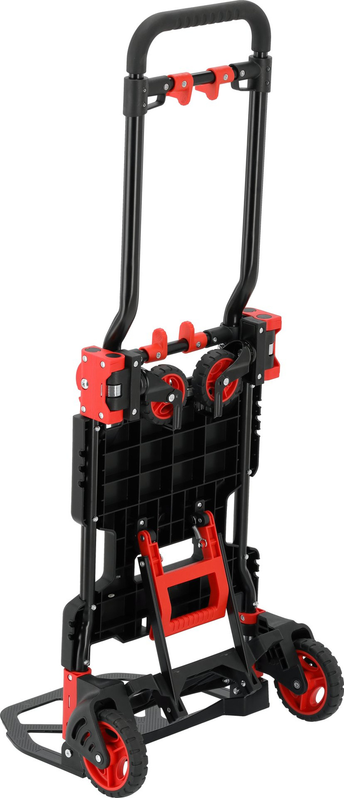 Składany wózek magazynowy 2 w 1 - może służyć jako wózek platformowy, jak i wózek ręczny. Po złożeniu zajmuje niewiele miejsca, dzięki czemu ułatwia zachowanie porządku oraz transport samego wózka. Kółka z tworzywa TPR nie niszczą powierzchni, po której porusza się wózek. Rozsuwany uchwyt zakończony jest wygodną rękojeścią z tworzywa.