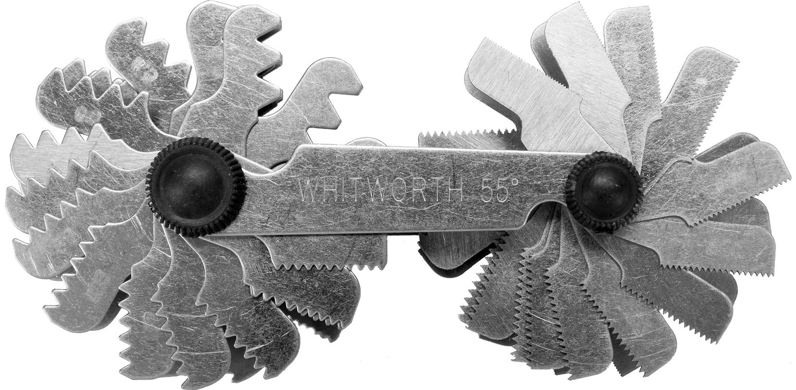 • Sprawdzian wykonany ze stalowej hartowanej blachy. Posiada 52 odchylane płytki z naciętymi wzorami gwintów przeznaczony do wewnętrznych i zewnętrznych gwintów metrycznych 60° o skoku 0,25-6,0 mm oraz Whitworth 55°, 4 - 62 BSW.