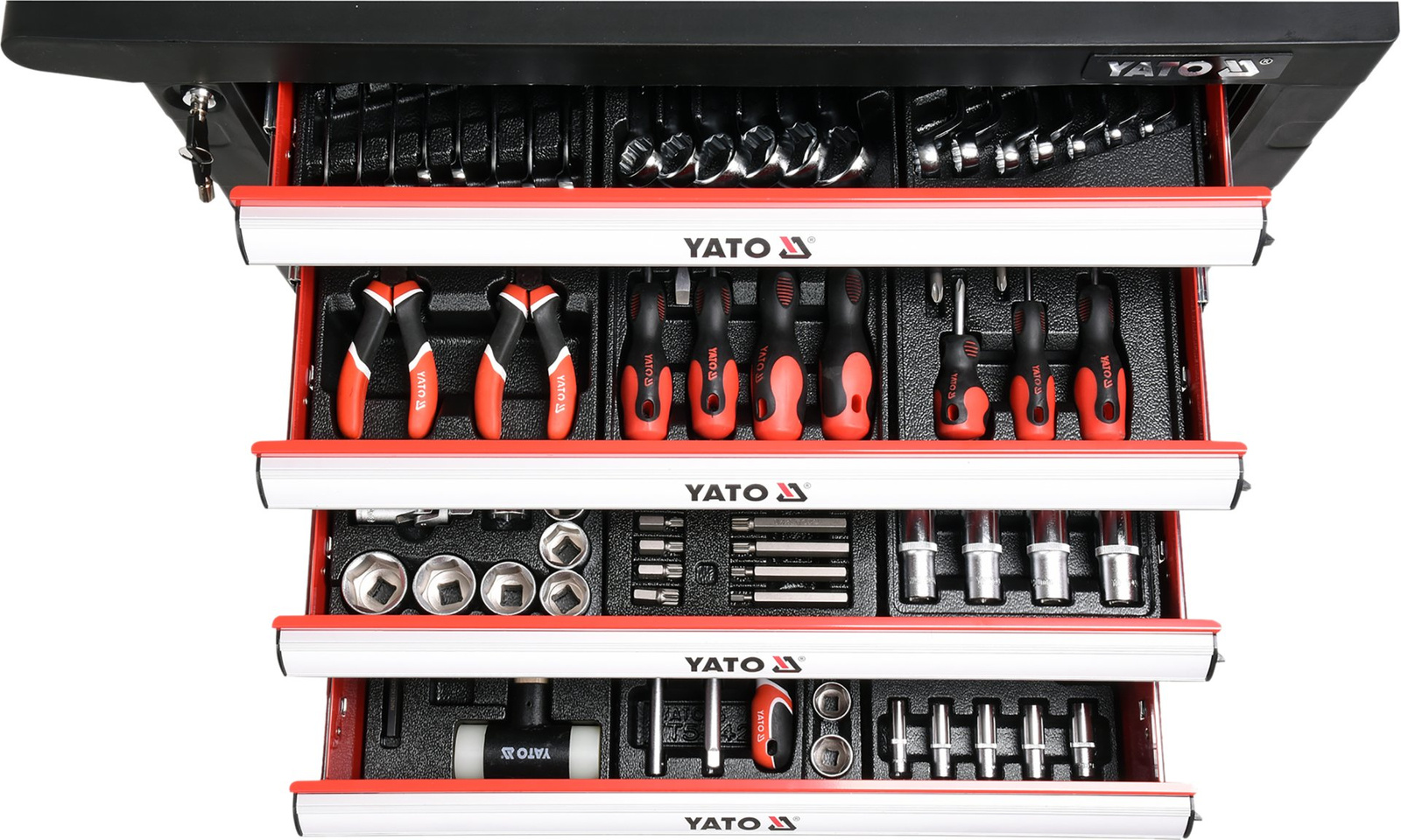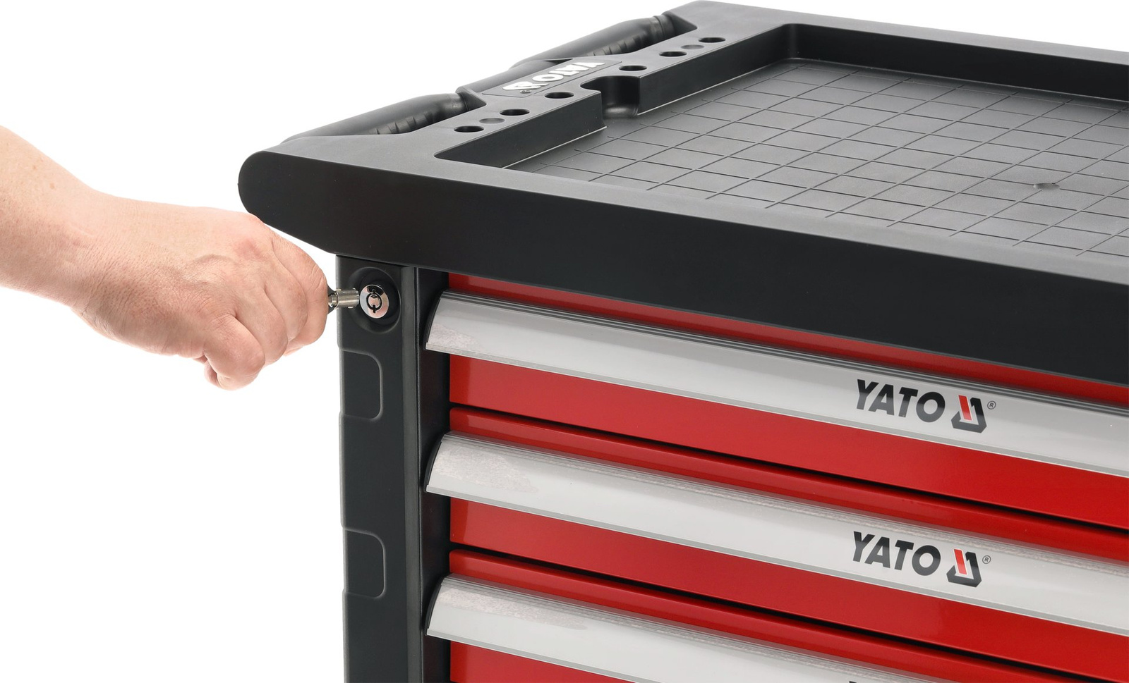 • Yato YT-55300 to praktyczna szafka narzędziowa z zestawem 177 części, idealna do profesjonalnych warsztatów i garaży. Wyposażona w 7 szuflad z pełnym wyposażeniem, solidną konstrukcję na kółkach oraz centralny zamek, zapewnia porządek i wygodę pracy.