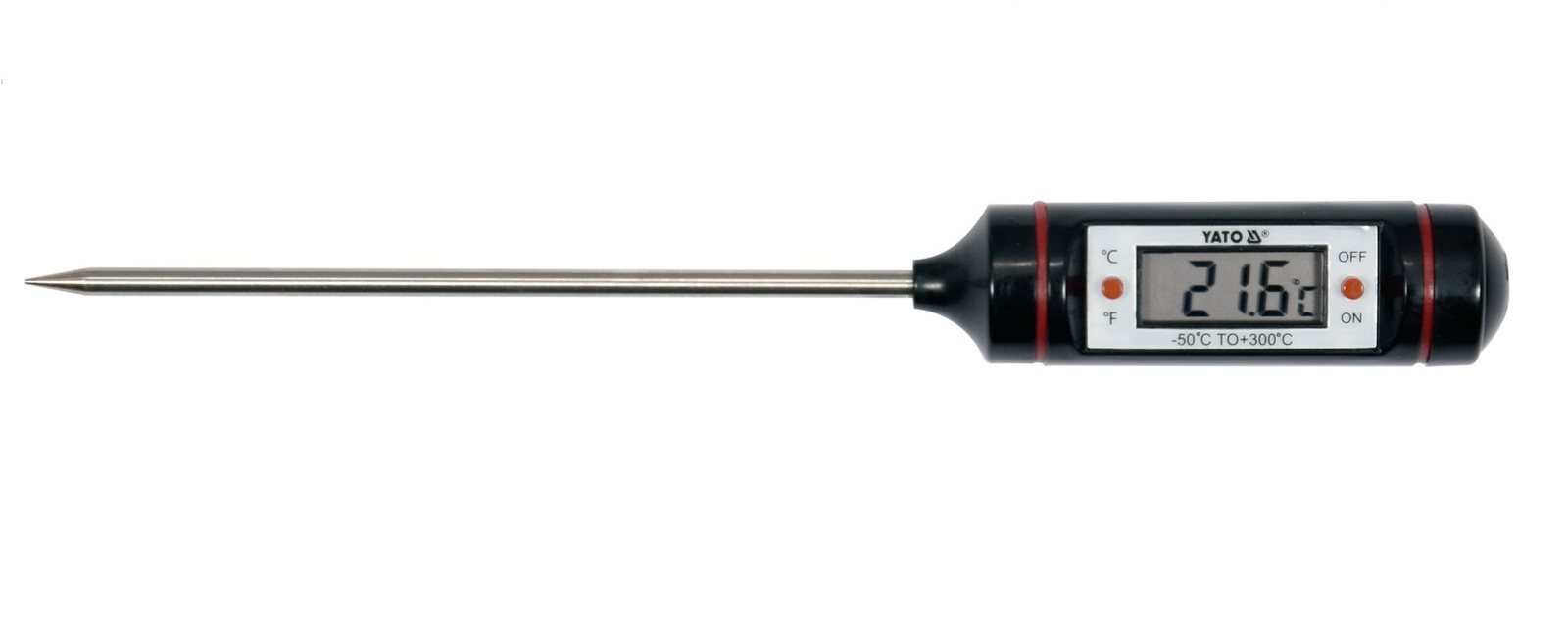 - Termometr elektroniczny Yato YT-72971 z sondą to precyzyjne narzędzie do pomiaru temperatury cieczy, ciał stałych i gazów w zakresie od -50°C do +300°C. Wyposażony w czytelny wyświetlacz LCD, funkcję automatycznego wyłączania i sondę o długości 130mm.