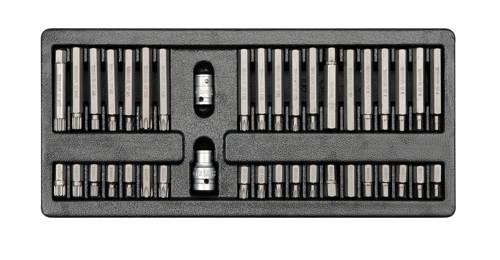 • Wkład do szafki narzędziowej, 40 szt., zawiera końcówki Torx, sześciokątne i Spline w długościach 30–75 mm oraz redukcje 1/2” i 3/8”. Uniwersalne zastosowanie, wykonane z trwałych materiałów S2 i CrV.