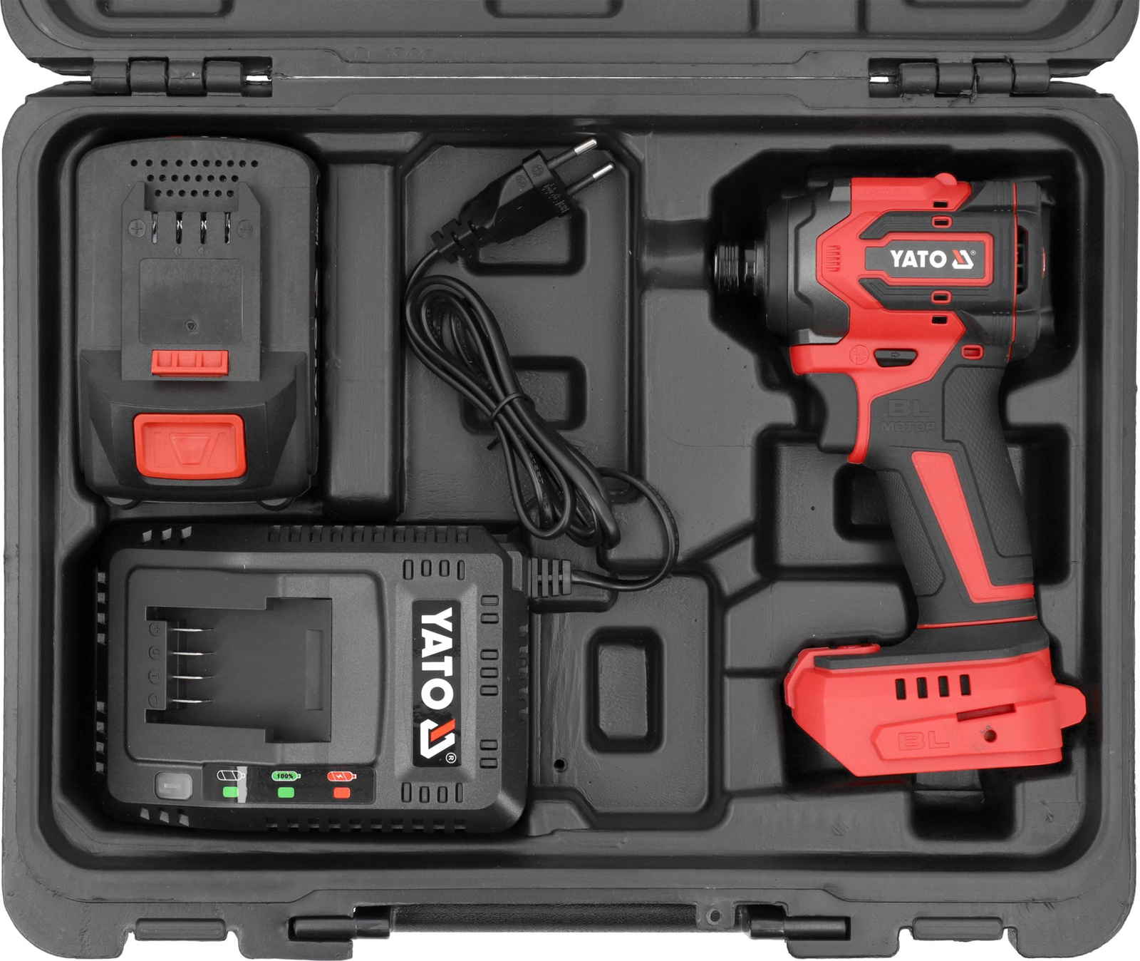Bezszczotkowa zakrętarka udarowa zasilana akumulatorem platformy YATO 18V. Jej główną zaletą jest bardzo krótki korpus o długości 90 mm. Dzięki temu pozwala na pracę w trudno dostępnych miejscach i prostopadłe dociskanie wkrętu do materiału. 4-stopniowa regulacja momentu dokręcającego i odkręcającego chroni użytkownika przed zrywaniem i przegłębianiem śrub. Udar styczny zabezpiecza przed przeskakiwaniem bita podczas wkręcania. Zakrętarka wyposażona jest w trwały uchwyt narzędziowy hex. Zakrętarka posiada zabezpieczenie termiczne chroniące przed przeciążeniem.
