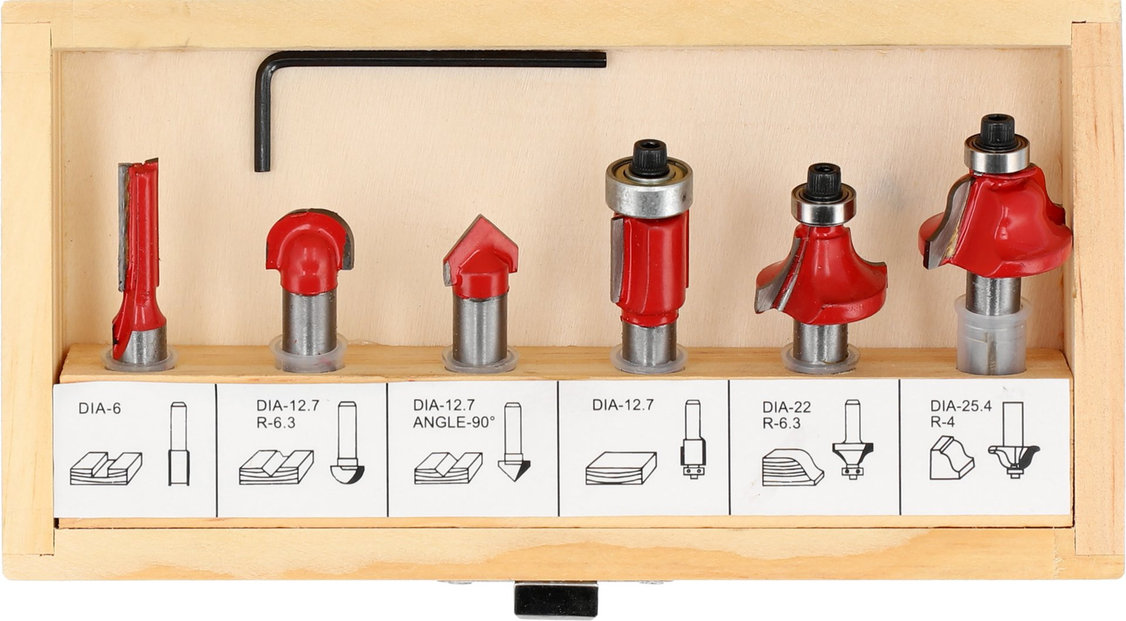 Zestaw 6 frezów trzpieniowych do obróbki drewna i niektórych tworzyw sztucznych przy użyciu frezarki z uchwytem fi 8 mm. Trzy frezy krawędziowe zakończone są łożyskiem ułatwiającym prowadzenie narzędzia. Zestaw zapakowany w drewnianej walizce.