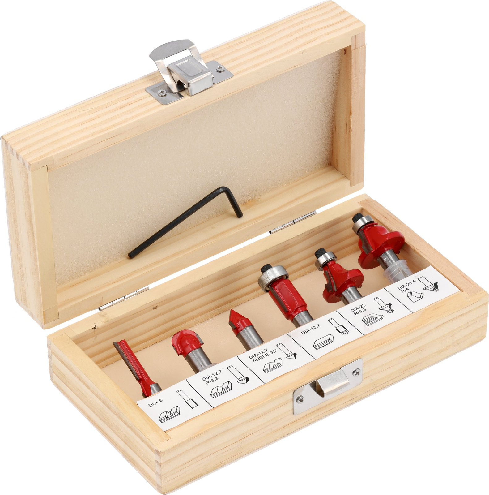 - Zestaw 6 frezów trzpieniowych do obróbki drewna i niektórych tworzyw sztucznych przy użyciu frezarki z uchwytem fi 8 mm. Trzy frezy krawędziowe zakończone są łożyskiem ułatwiającym prowadzenie narzędzia. Zestaw zapakowany w drewnianej kasetce.