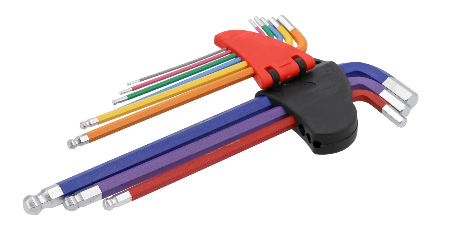 Zestaw 9 bardzo długich kluczy imbusowych w rozmiarach 1,5-10 mm z końcówką kulistą.