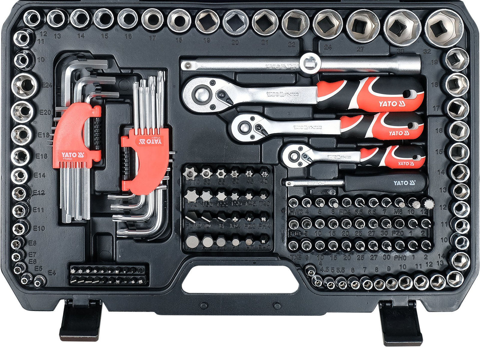 - Zestaw 198 narzędzi YATO w walizce. Trzy napędy: 1/4", 3/8", 1/2". Wykonany ze stali CrV, CrMo i S2. Grzechotki 72T z systemem AS-DRIVE zapewniają precyzyjną pracę i trwałość. Idealny do warsztatu i domu.