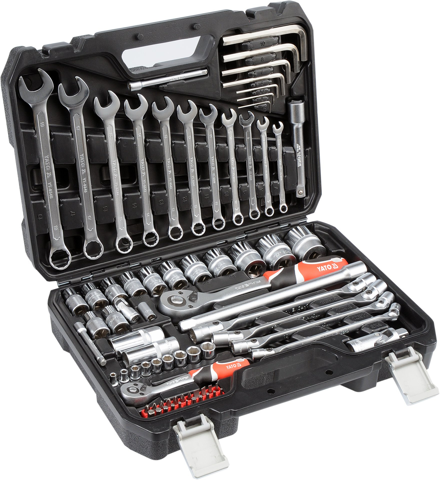 Zestaw narzędziowy Yato składa się z 77 elementów umieszczonych w wygodnej walizce z tworzywa sztucznego. Narzędzia zostały precyzyjnie wykonane z materiałów zapewniających ich niezawodność.