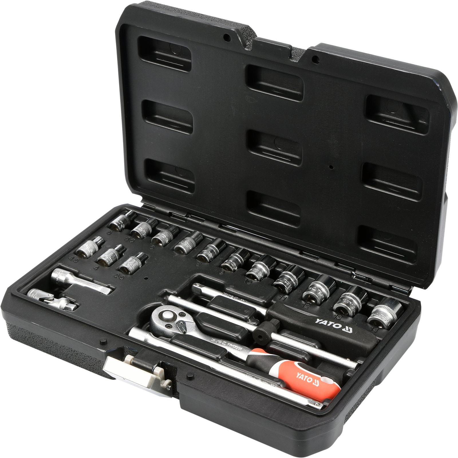Profesjonalnej jakości zestaw narzędziowy marki Yato, polecany do serwisów i warsztatów. Klucze nasadowe, jak i napęd nasadek, zostały wykonane z wytrzymałej narzędziowej stali chromowo-wanadowej CrV 50BV30. Nasadki wyposażone w system AS-Drive, zwiększający maksymalny moment o 25%, przy pełnej ochronie obrzeży nakrętek, nasadki z dwutonowym wykończeniem powierzchni. Grzechotka posiada trójkomponentową rękojeść oraz 72 zęby (skok roboczy 5 stopni).