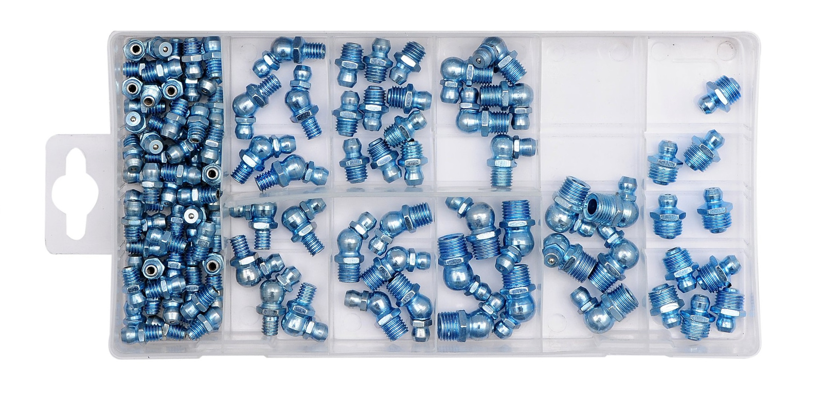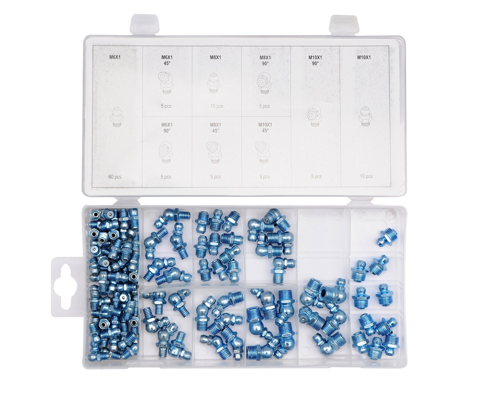 - Zawartość zestawu: smarowniczki x110 (M6x1 mm x60, M6x1 mm 45˚ x5, M6x1 mm 90˚ x5, M8x1 mm x10, M8x1 mm 45˚ x5, M8x1 mm 90˚ x5, M10x1 mm x10, M10x1 mm 45˚ x5, M10x1 mm 90˚ x5)