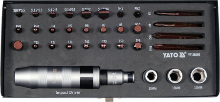 Wkrętak udarowy marki Yato o długości 168mm z 31. czernionymi końcówkami. Wkrętak wykonany z wytrzymałej stali CrV, odpornej na odkształcanie podczas uderzania młotkiem, bity natomiast z wysokiej jakości stali S2.