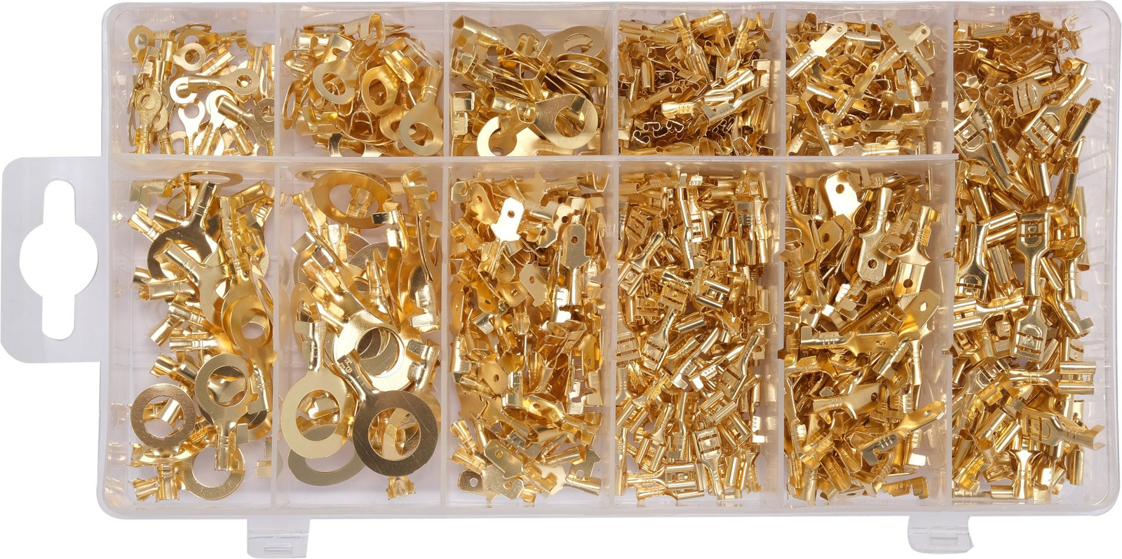 - Zestaw 750 złączy elektrycznych YATO (YT-068685) w praktycznym organizerze. Zawiera tulejki, oczka, szybkozłączki i konektory w różnych rozmiarach. Idealny do napraw i instalacji elektrycznych w warsztacie, domu i motoryzacji.