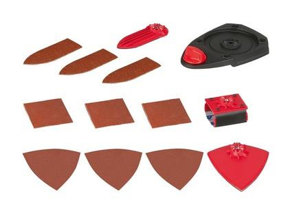 - Zawartość: płyta szlifierska, 3 przystawki (palcowa, elastyczna i delta), 9 papierów szlifierskich